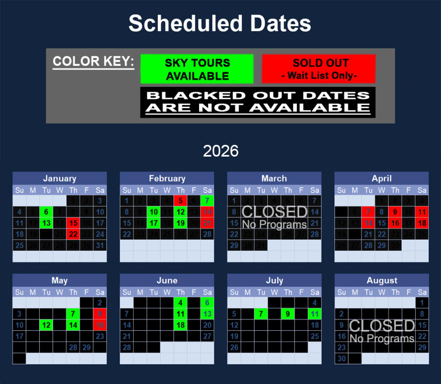 GREEN dates are AVAILABLE for public or, possibly, private tours. These have no interfering moonlight.RED dates are SOLD OUT. You may email Dennis to request placement on the waiting list.BLACKED OUTdates are NOT AVAILABLE for any public or private tours.